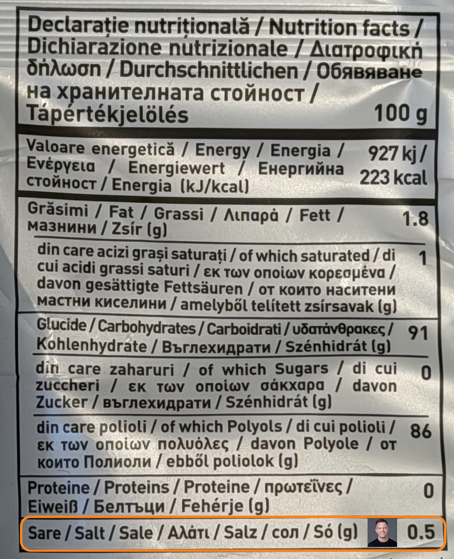 Vreau să te uiți cu atenție jos de tot. Vei descoperi cantitatea de sare la 100g de produs.