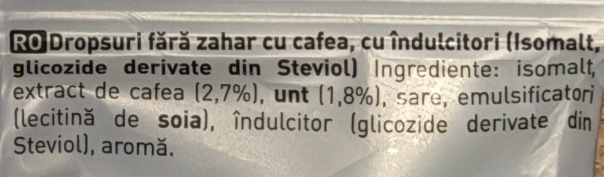 isomalt 95%, extract de cafea 2.7%, unt 1.8%, sare 0.5%, lecitină de soia, stevia, aromă.
