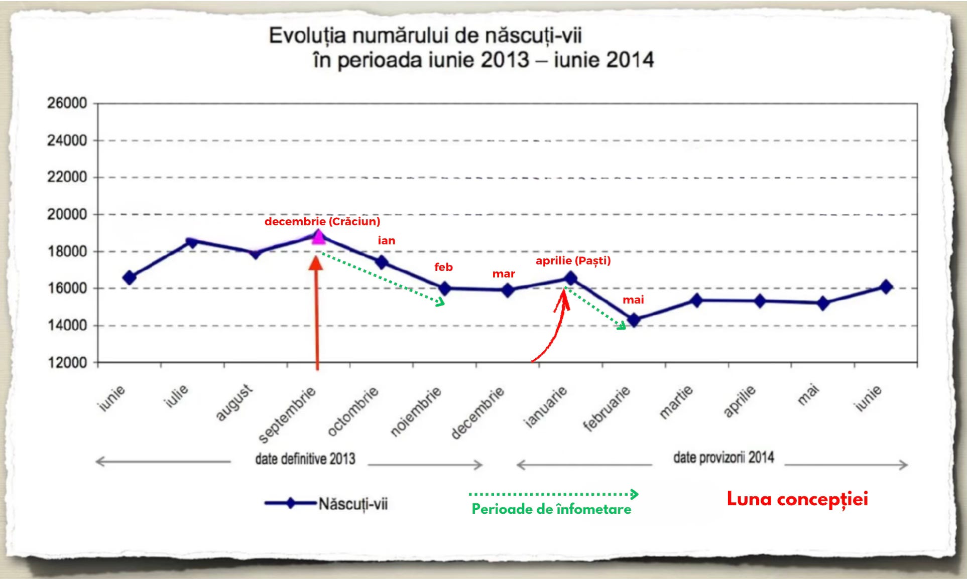 Poți observa în grafic cum pe la 9 luni de la Paști mai este un vârf de nașteri.