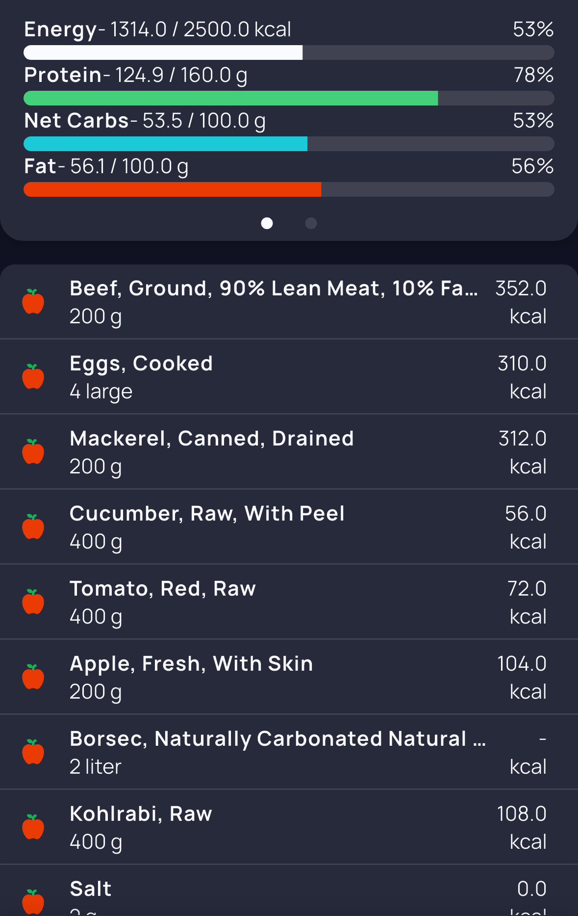 3 ouă + 200g macrou (2 conserve de exemplu) + 200g chiftele de hamburger de vită + 1,2 kg de legume + un măr mare de 200g + un pic ulei de măsline, sare + 2 litri de apă carbogazoasă Borsec.