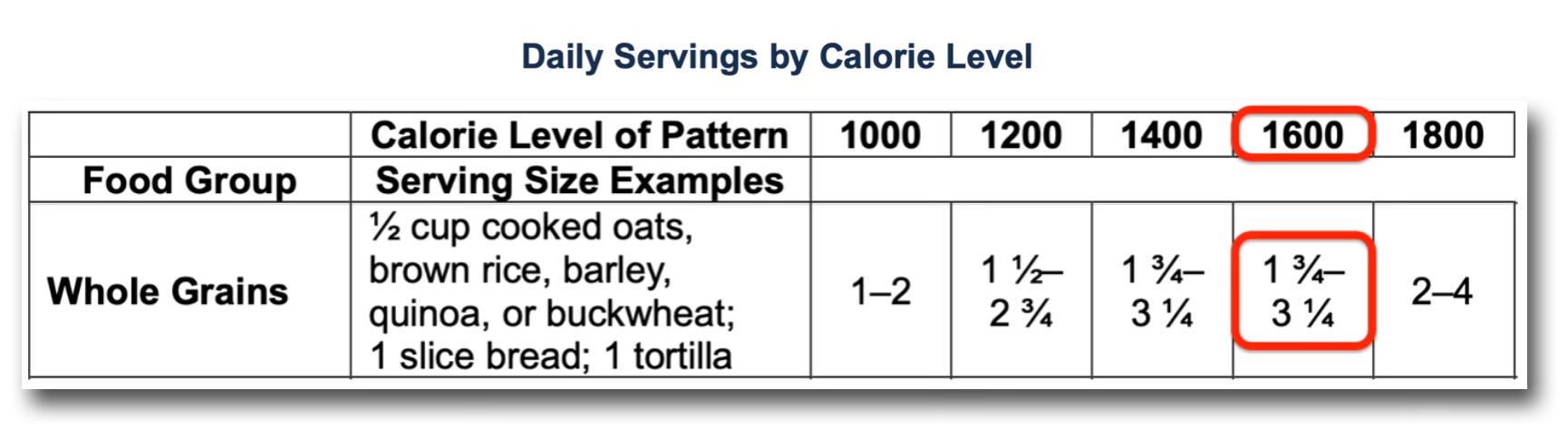 O femeie sedentară care are un consum caloric de 1.600 de calorii pe zi (majoritatea) ar putea să consume între 1 ¾ și 3 ¼ porții de cereale pe zi.