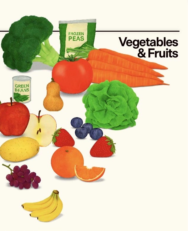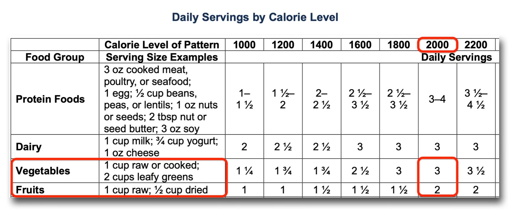 „Pentru un necesar caloric de 2.000 de calorii, pentru adulți se recomandă 3 porții (servings) de legume și 2 porții (servings) de fructe pe zi.”