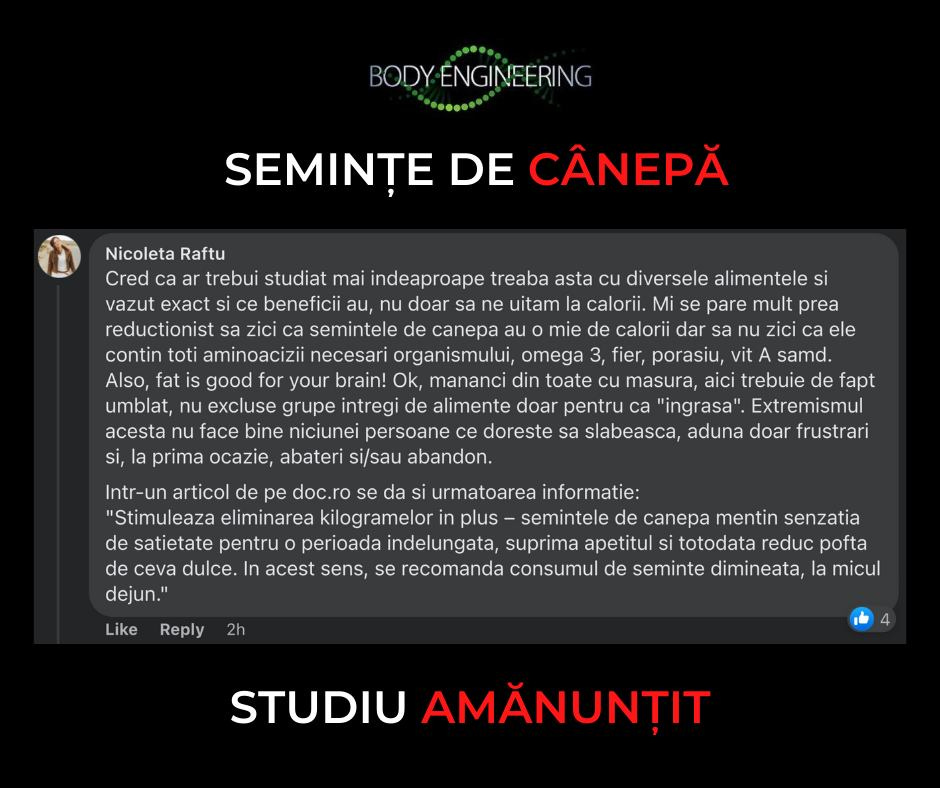„Valentin, sunt ok semințele de cânepă? Eu le foloseam în salate. Sau dacă vreau să slăbesc mai bine nu?”