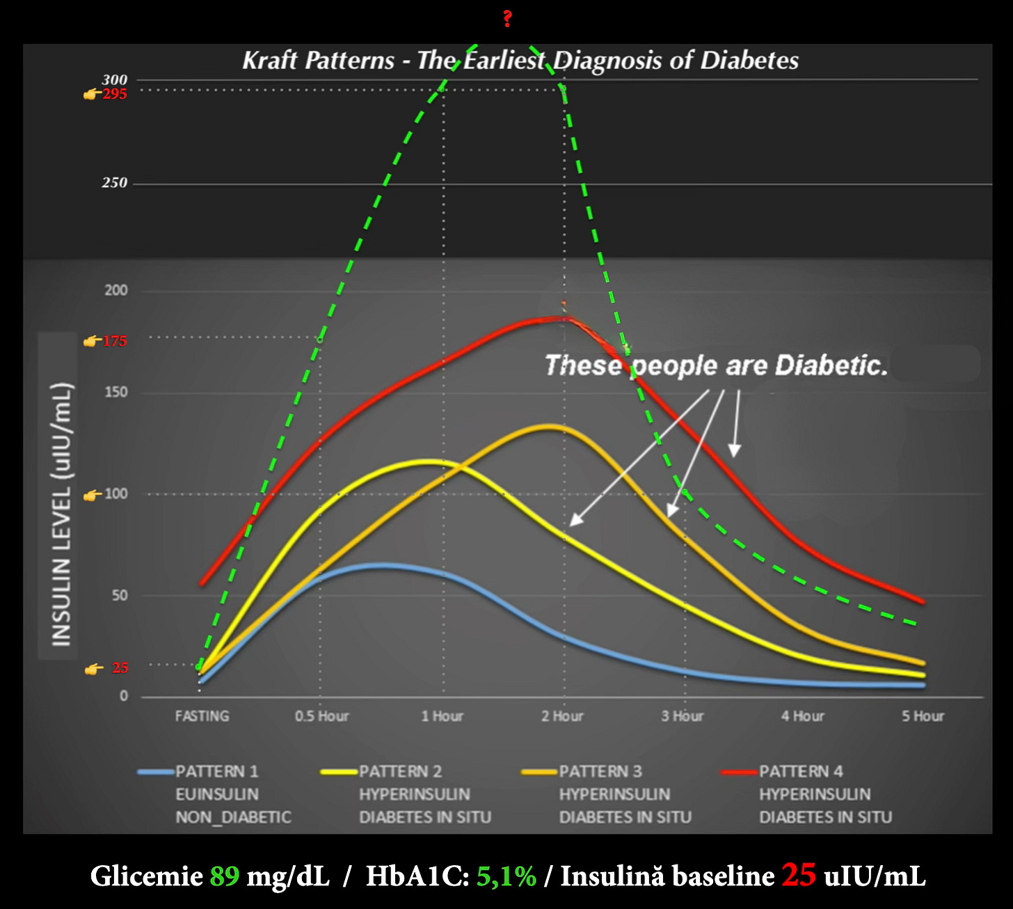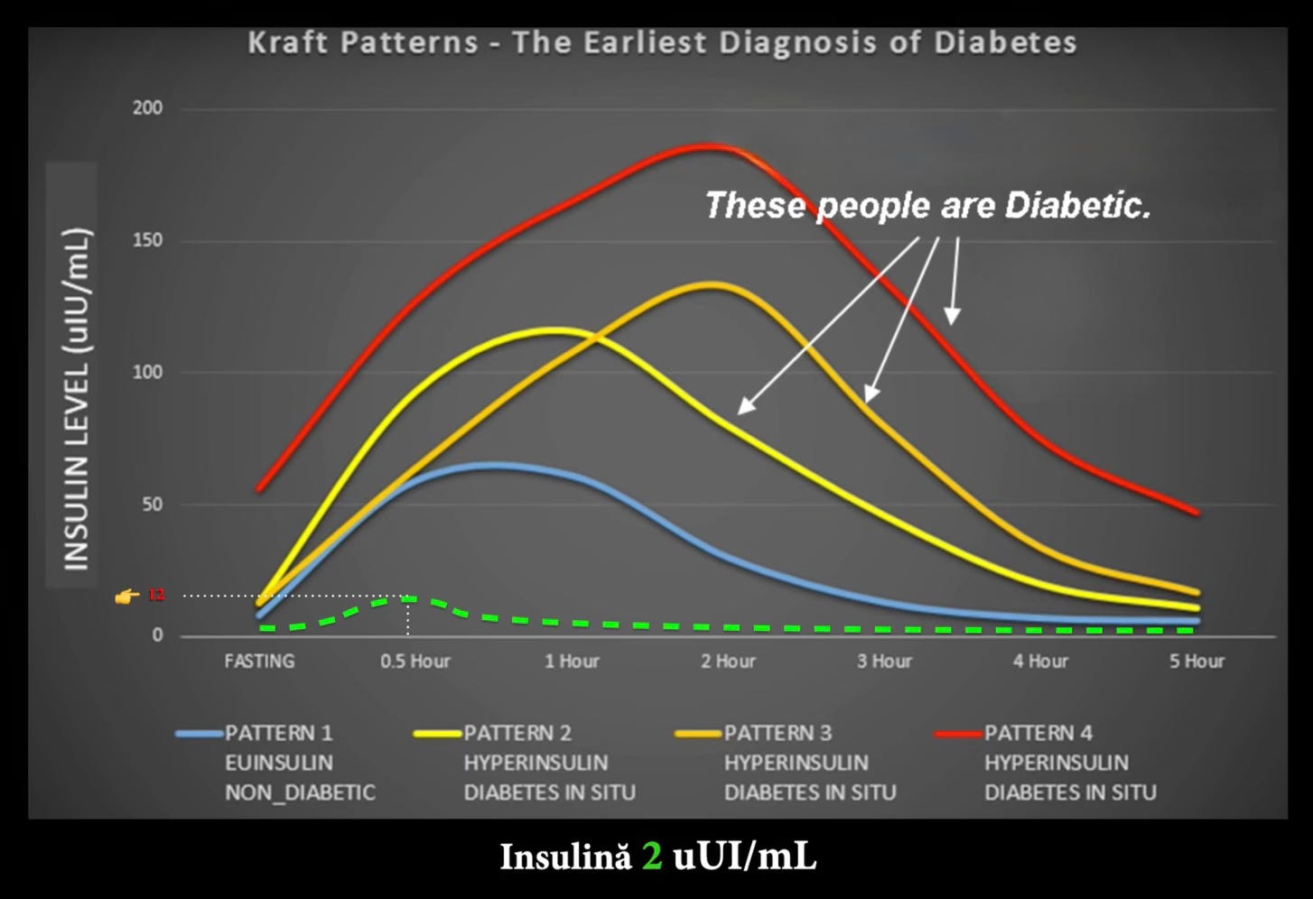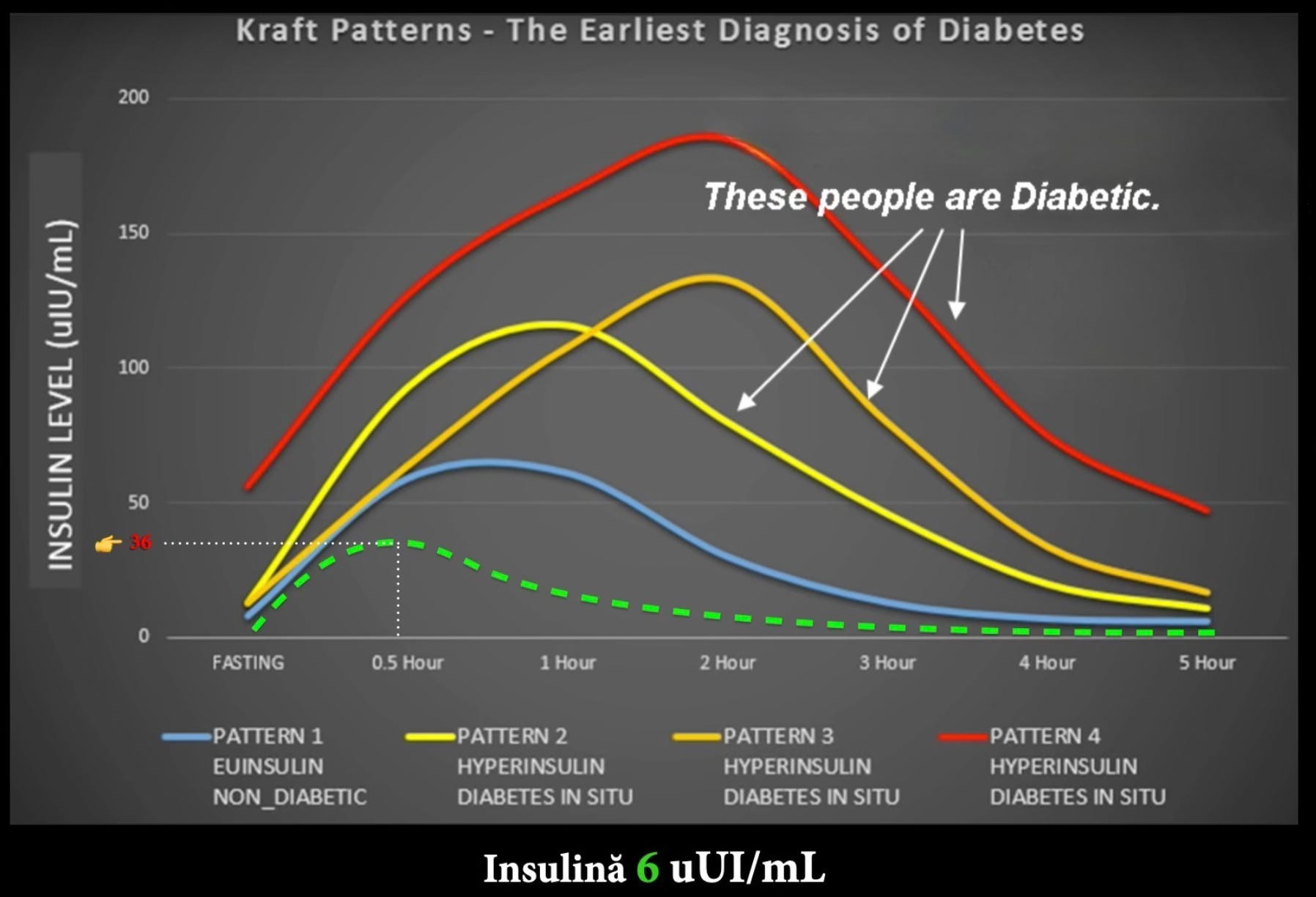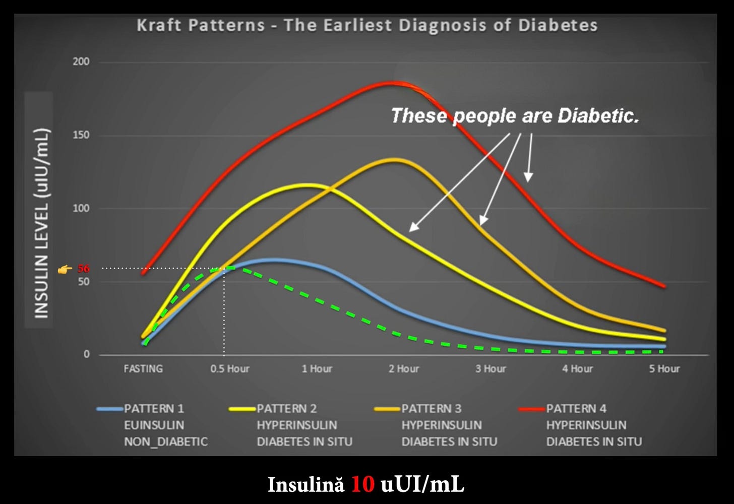 Linia verde punctată reprezintă cantitatea de insulină secretată de pancreas pe o perioadă de 5 ore.