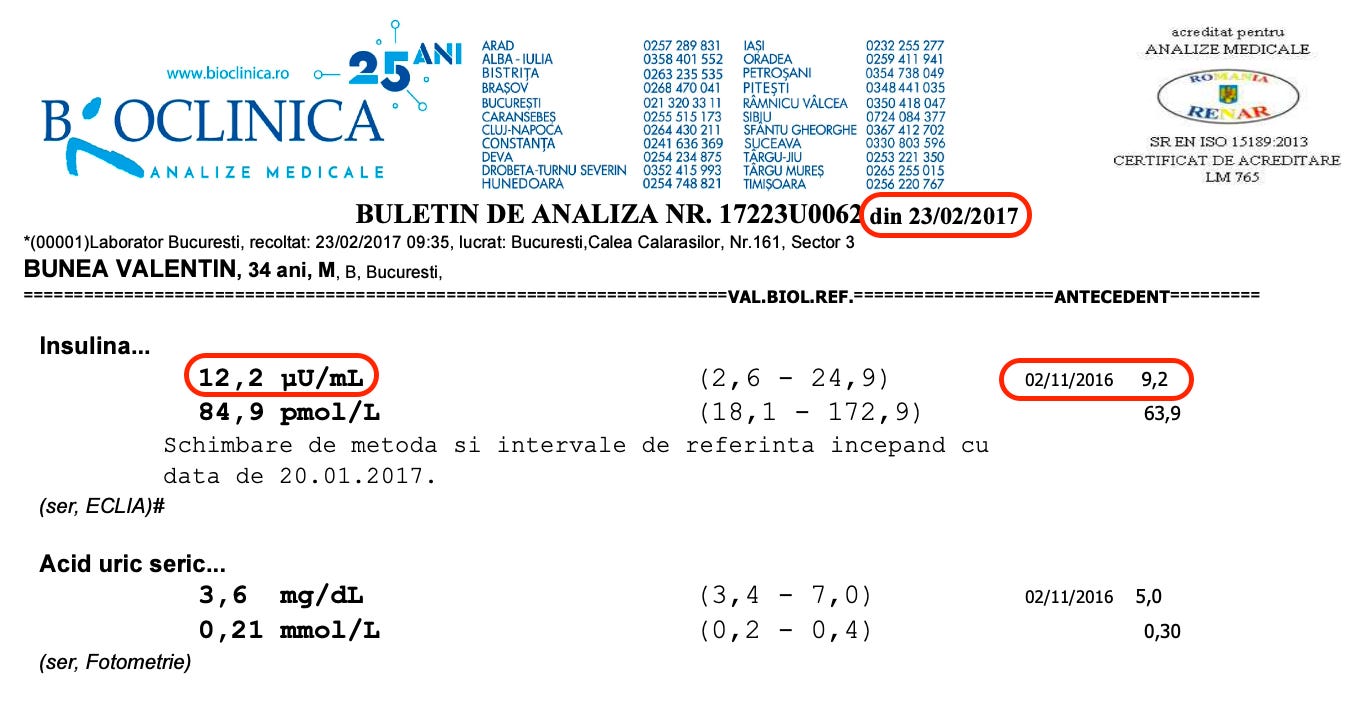 Astăzi, cam la aceeași greutate (88-92 kg), nivelul insulinei bazale este între 2.7 și 3.7 µIU/mL.