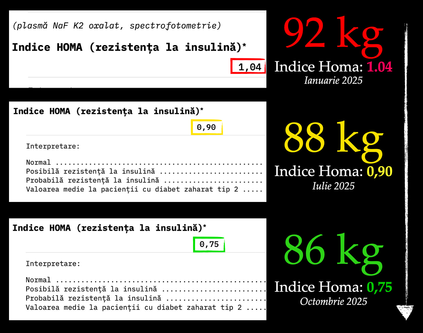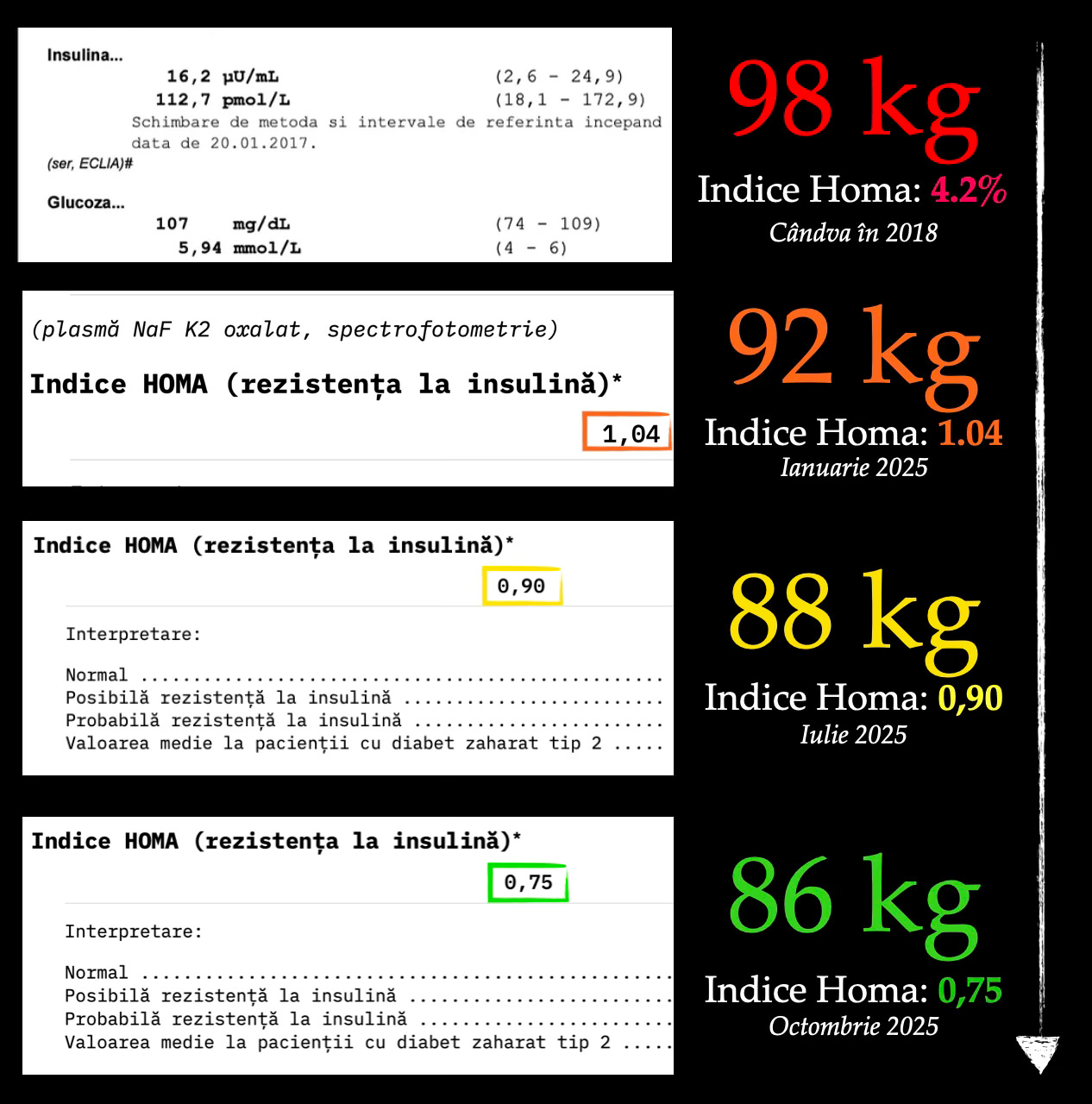 la 98 de kilograme aveam insulina 16 și indicele Homa 4.2%. Adică de 6x mai mare decât un nivel elite.